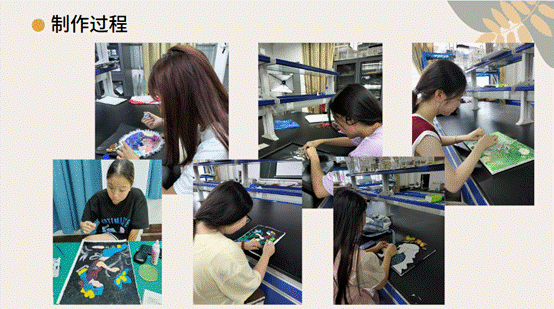 在制作过程中,同学们积极去请教老师,与各组讨论。由开始的迷茫到一步步摸索出自己喜欢的方式来制作肌理画。