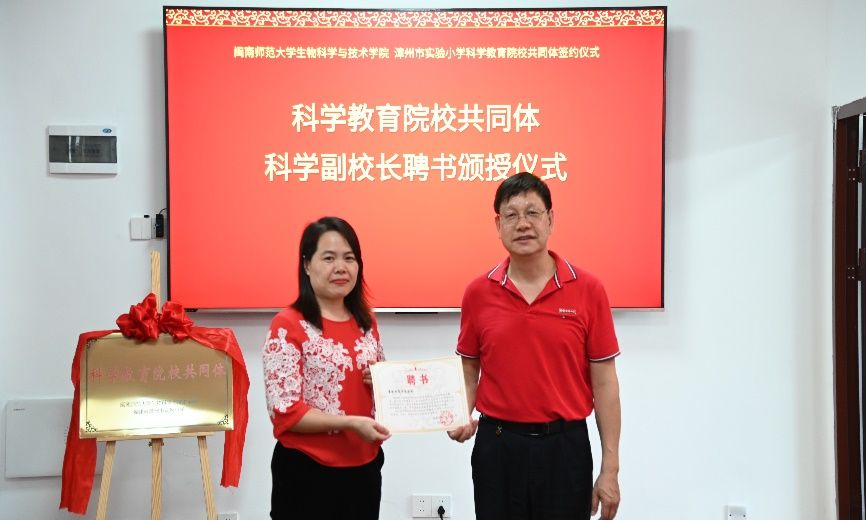 为了进一步加强科学教育的师资力量,漳州市实验小学聘请古天乐澳门太阳集团城生科院张丹凤教授担任科学副校长,由陈庆煌校长为张丹凤老师颁发证书。