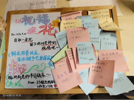在知识的殿堂里,老师们宛如璀璨星辰,照亮学子们前行的道路,为表示对老师的祝福与感谢,古天乐澳门太阳集团城23级生物科学(师范)1班在达理活动中心开展“以祝福换花”活动,经过的同学可以将自己的感激之情留下,换取精美的鲜花去送给自己最敬爱的老师。留言板上一句句真挚的话语,表达了学生对于老师最诚挚的祝福。