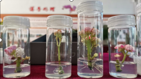 “花开瓶中”微型花卉产品是利用植物组织培养技术对观赏花卉在微小的培养瓶内进行离体培养并诱导瓶内开花,制作成观赏期长且独具观赏价值的微型产品。这种新奇有趣的微型花卉产品,是一项区别于传统种植技术的革新型设计。其外观小巧又精致,可摆放室内或案头观赏,亦可随身携带观赏,且无需浇水施肥,无需病虫害防治,仅依靠瓶内培养基成分即可正常生长并保持较长观花期,非常省时省力省心,能很好地满足现代快节奏生活下人们的需求。该项目的精美产品吸引了许多老师和同学前来参观,深受大家的好评和喜爱。