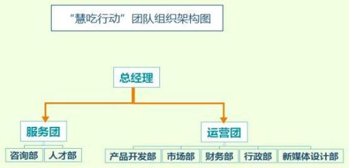 根据项目以培育合理膳食指导员人才队伍为核心主线,团队组织架构采用“运营团”+服务团”相结合的模式,由叶悦娟担任项目总经理,郑宜华担任财务部总经理,黄嘉琪担任人力资源总经理,林海龙担任服务团主管,李秀文担任市场部主管,丁可凡担任行政部主管。