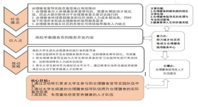 针对大学生,以农村合理膳食指导员的需求为导向,而后在农村需求扩大的情况下,与当地的营养健康协会机构/组织的资源及专业人士力量合作深入到城乡基层的服务中去。