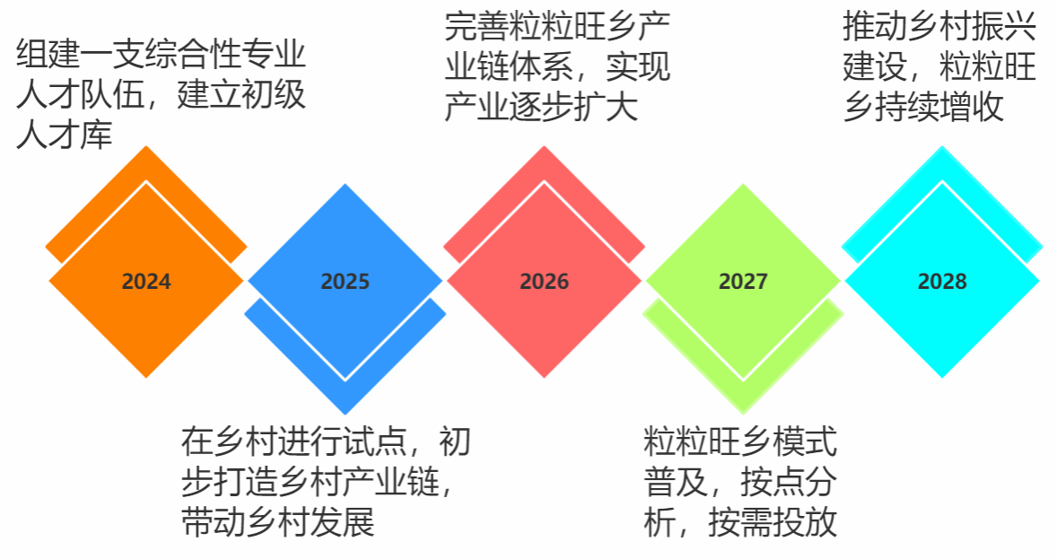 “粒粒旺乡” 作为一个从基层实践起来的青年创业项目,团队所有成员坚定“倡导人人成为合理膳食宣导者及实践者”的理想信念。团队制定了 2024年至 2028年期间的五年发展规划,如下图: