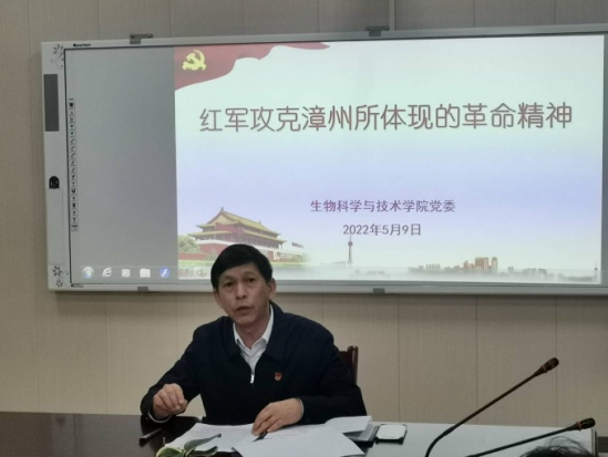 为纪念红军攻克漳州90周年,进一步激励和动员学院师生感悟红色记忆,了解红军攻克漳州的辉煌历史,从中汲取智慧和力量。5月9日上午,院党委书记蒲俊之讲授题为《红军攻克漳州所体现的红色革命精神》专题党课,党课采取线上线下相结合的方式进行,生科院全体教职工和部分学生党员参与了本次党课学习。
