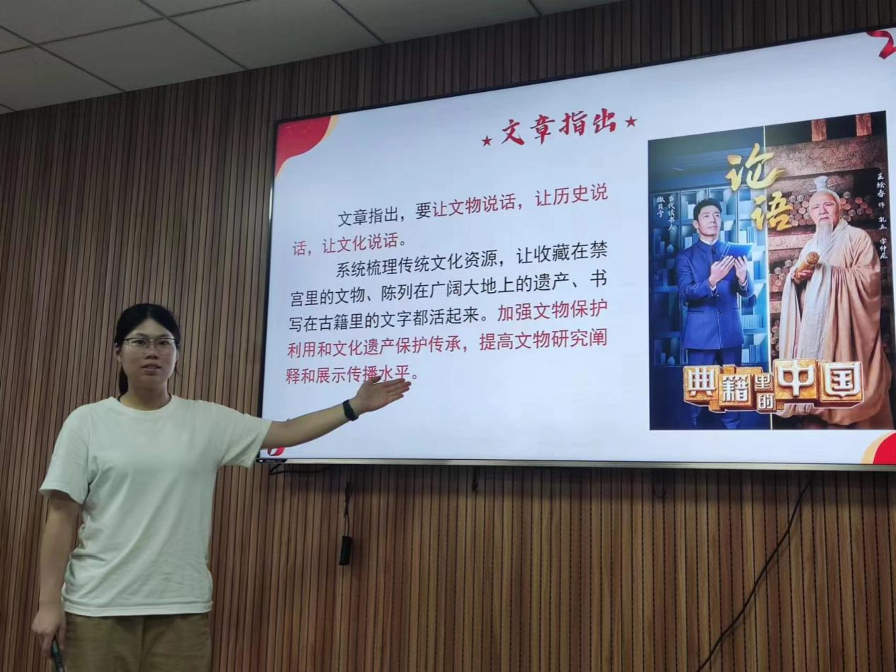 周芳婕同志首先强调了文化遗产保护的重要性,介绍了其定义、分类和价值,深化了党员们的认识。随后,她解读了习近平总书记关于文化遗产保护的论述,强调了文化自信与文化传承的紧密联系及其在国家战略中的地位。通过具体事例展现了习近平总书记对中华文化的深厚情感,并分享了学习体会,倡议大家积极参与文化遗产保护,传承和弘扬中华优秀传统文化。