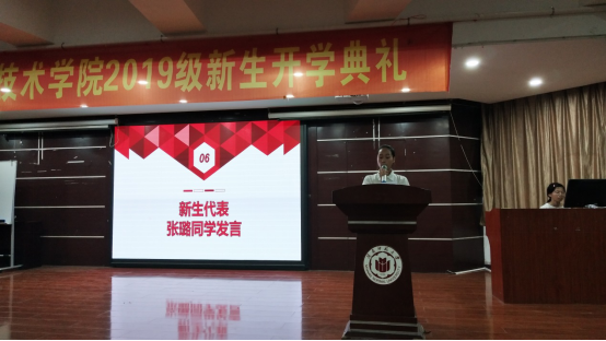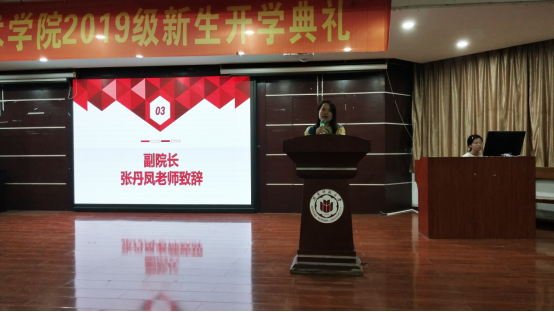 典礼伊始,全体奏唱国歌。学院副院长张丹凤老师代表学院致辞,向新同学介绍生科院的办学历史与成绩、师资力量、人才培养、学科建设、实践活动等方面的情况。对新同学提出殷切希望:首先,立心立德,学会责任担当;其次,开放包容,学会协同合作;第三,维新创新,敢于竞争挑战。希望同学们能够养成优雅的竞争心态,敢于竞争,勇于挑战,四海平江心自阔,豪情万丈任我行。