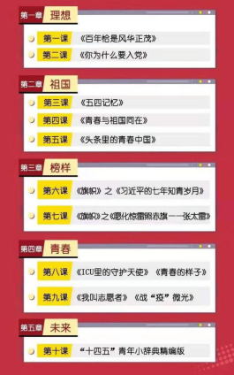“寒假十课”系列团课视频。每节课虽然只有几分钟,但涵盖了共青团员理想的滋养、 “一集正三观”的硬核知识以及热血沸腾的动人故事。