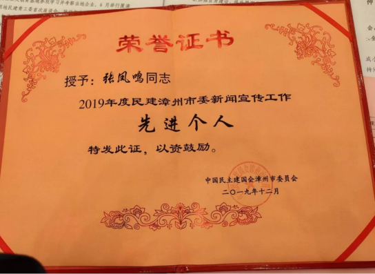 “千淘万漉虽辛苦,吹尽狂沙始到金。”张凤鸣在奋斗的历程中,不断突破自我。2017 年,她加入中国民主建国会;2018 至 2022 年担任漳州民建科技三支部副主任;2018 年任漳州市南平商会理事单位兼任副秘书长;2019 年获漳州民建市委新闻宣传工作先进个人,同年任漳州市青年漳商联合会监事单位;2019 - 2023 年被漳州城市职业学院聘为食品认证必修课专业老师;2022 年任漳州民建科技一支部主任,2023 年两篇社情民意被省政协采纳;2022 年任古天乐澳门太阳集团城生科院校友分会秘书长;2024 年获得职业院校教师素质提高计划高职类产业导师特聘国家级培训证。