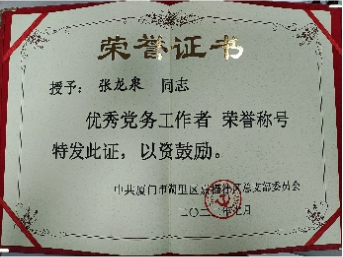 目前,张龙泉学长已累计获得2015年厦门国际航空港集团年度营销奖、2019年福建省花卉协会优秀工作者、2022年厦门市殿前街道嘉福社区优秀党务工作者等奖项